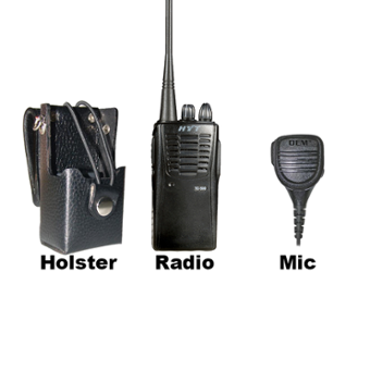 Handheld Radio, antenna, charger, remote speaker mic, and holster to protect radio and prevent loss or drops by users.